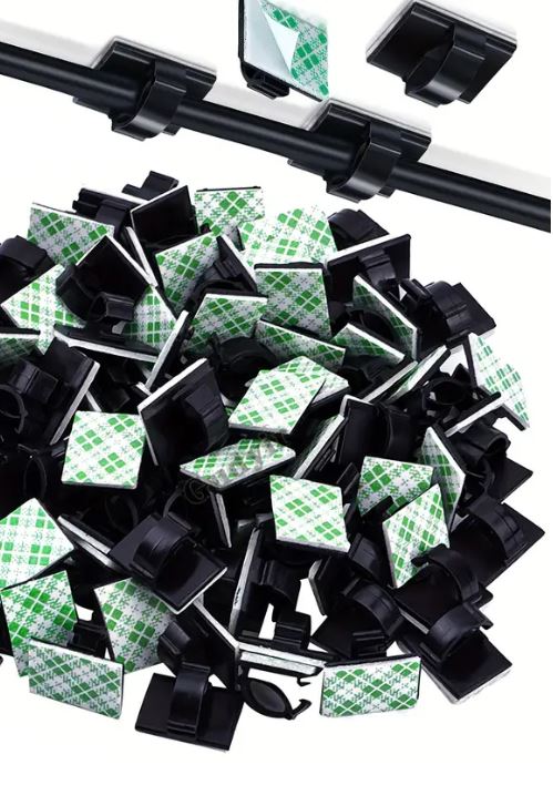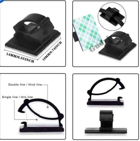 - Sticky cable holder clips with self-adhesive pads securely grip surfaces and can be easily removed without damage